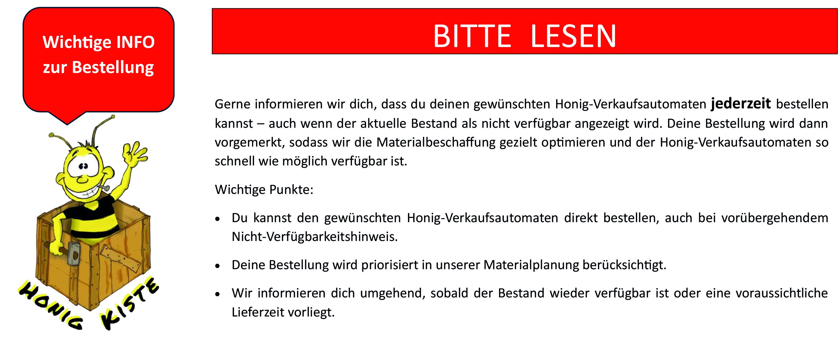 • Die Honigautomaten sind 24/7 für die Kunden verfügbar.